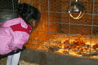 Olivia looking at chicks at another farm.