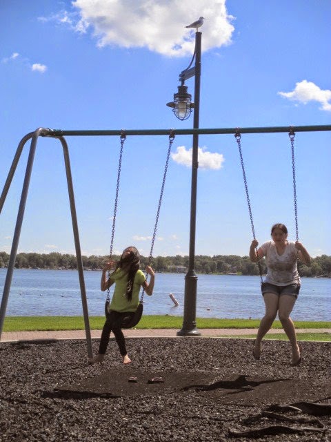 The girls played on the swing for a while. Notice the seagull who is sitting on the post. It flew up to watch them after we were done feeding it.