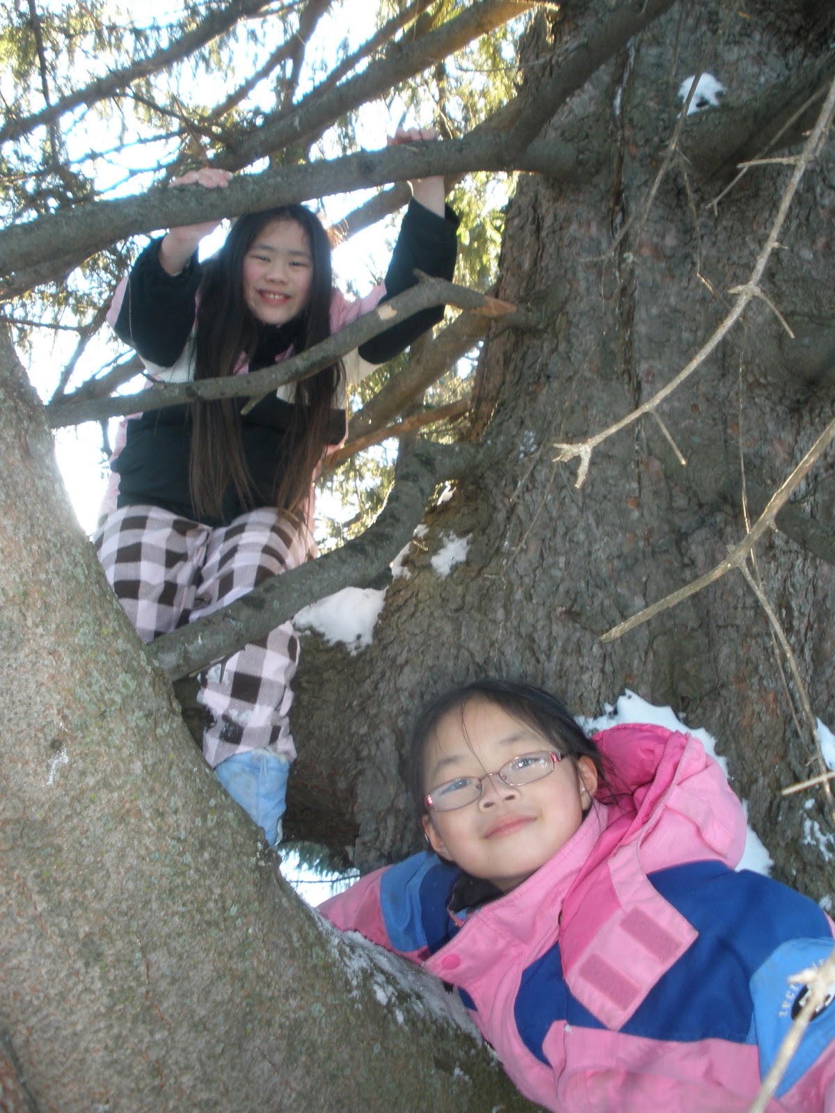 Climbing trees was a favorite activity to do whenever there wasn't snow on the ground. The pine tree that they are climbing below is the largest one on our farm with huge limbs - perfect for climbing.